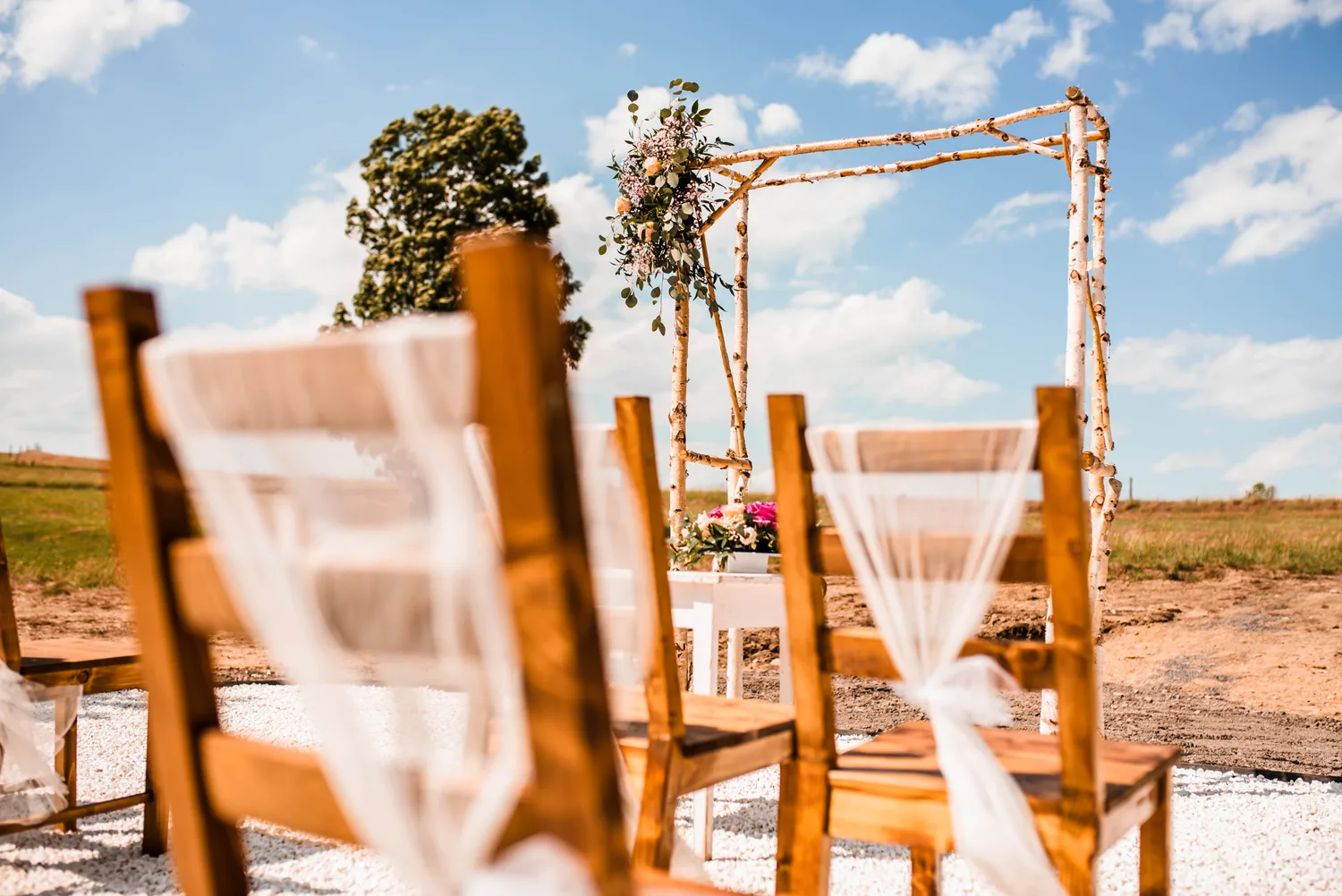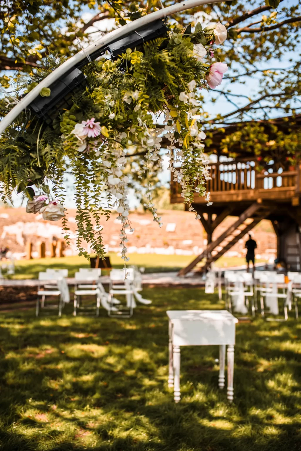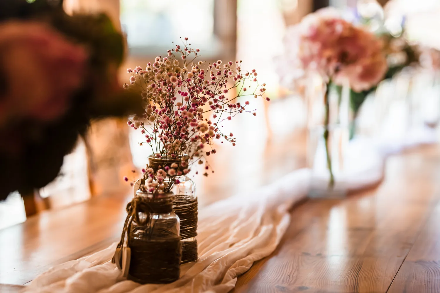 Rustikální styl, doplněný o květinové aranžmá a elegantní dekorace, které vytvářejí útulnou a romantickou atmosféru.